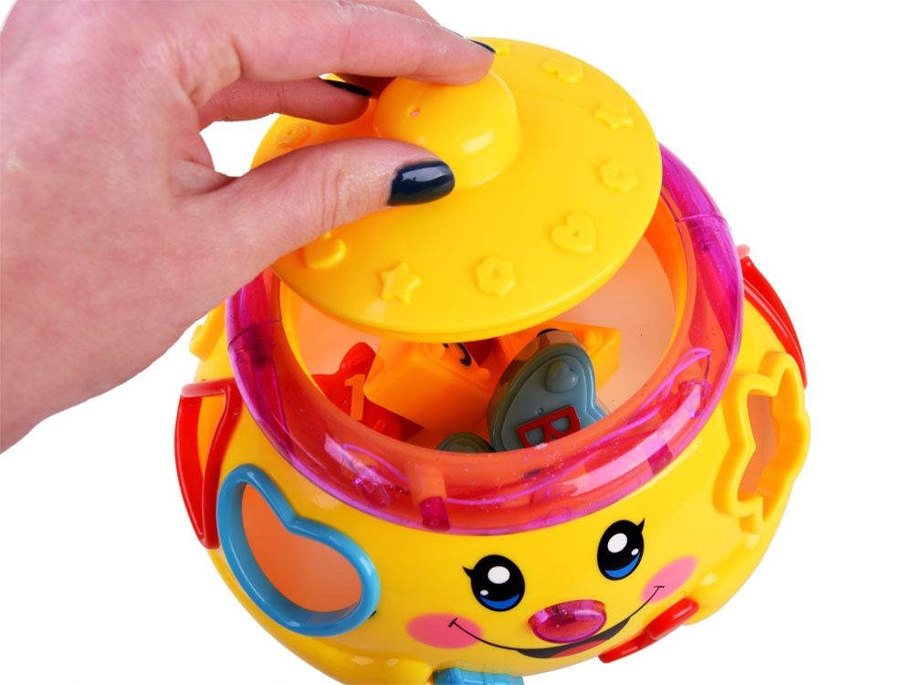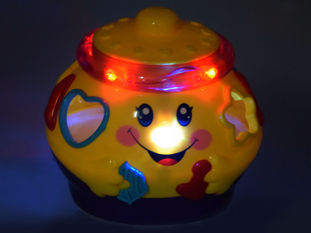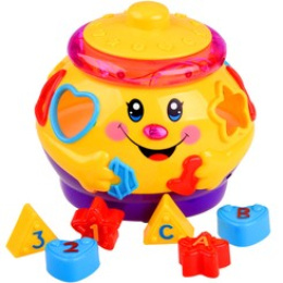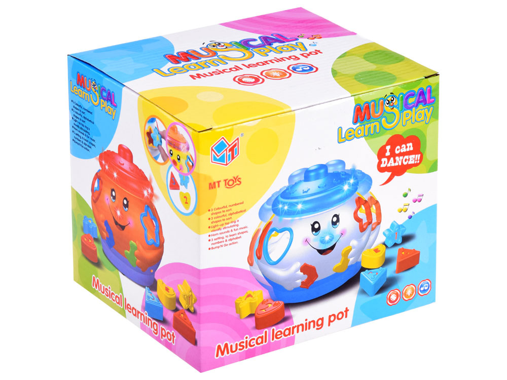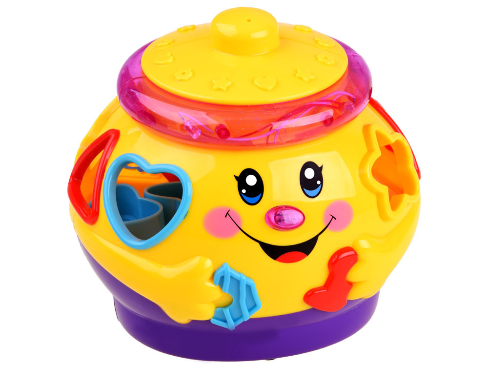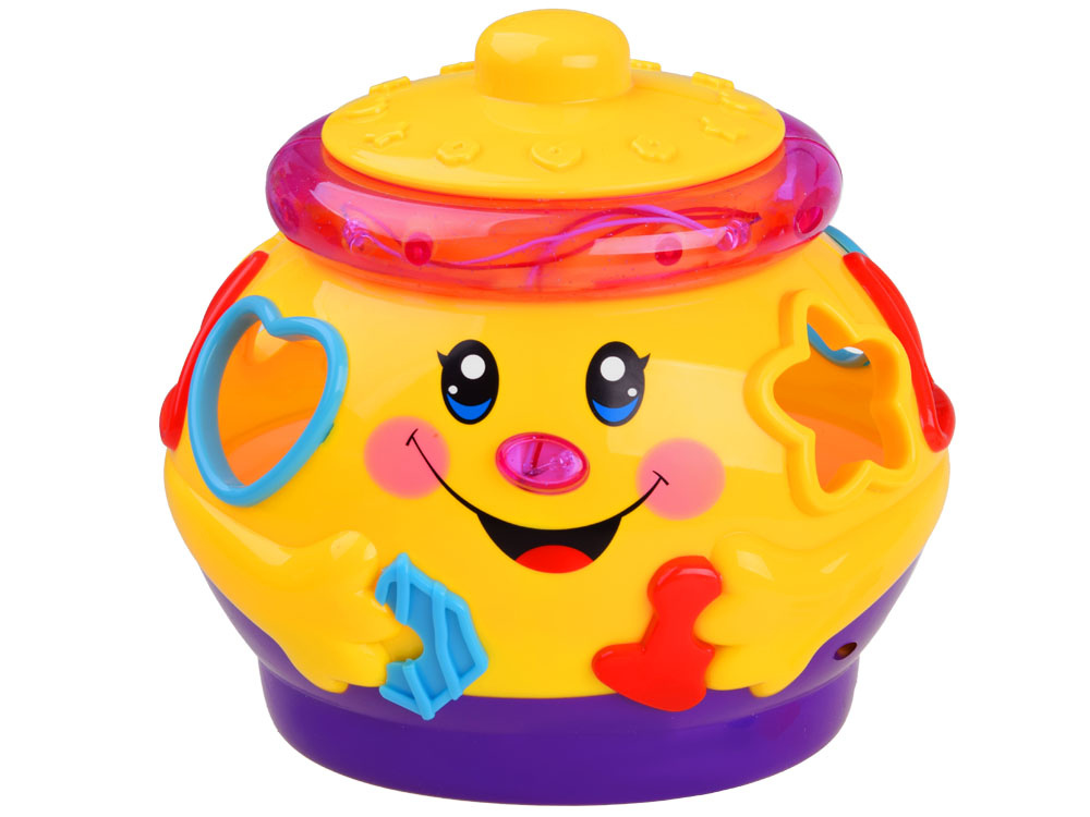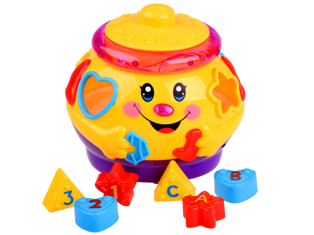 Интерактивна играчка от серията "Учи и играй", която се фокусира върху ученето чрез игра. Играчката съдържа 6 цветни кубчета, които трябва да се поставят в предвидените за тях отвори. Всяко блокче има различна форма и е обозначено с номер или буква. по време на играта детето се научава да различава форми, цветове. Цветното, весело гърне свири весела музика, когато се включи, кара се на колелца и се люлее весело, а ръбът свети и мига с цветни светлини. след като блоковете се поставят в сортиращите устройства, те се поставят в корема на съда. Обемистият корем на гърнето може да побере не само кубчета, но вероятно и други необходими за малчугана съкровища.