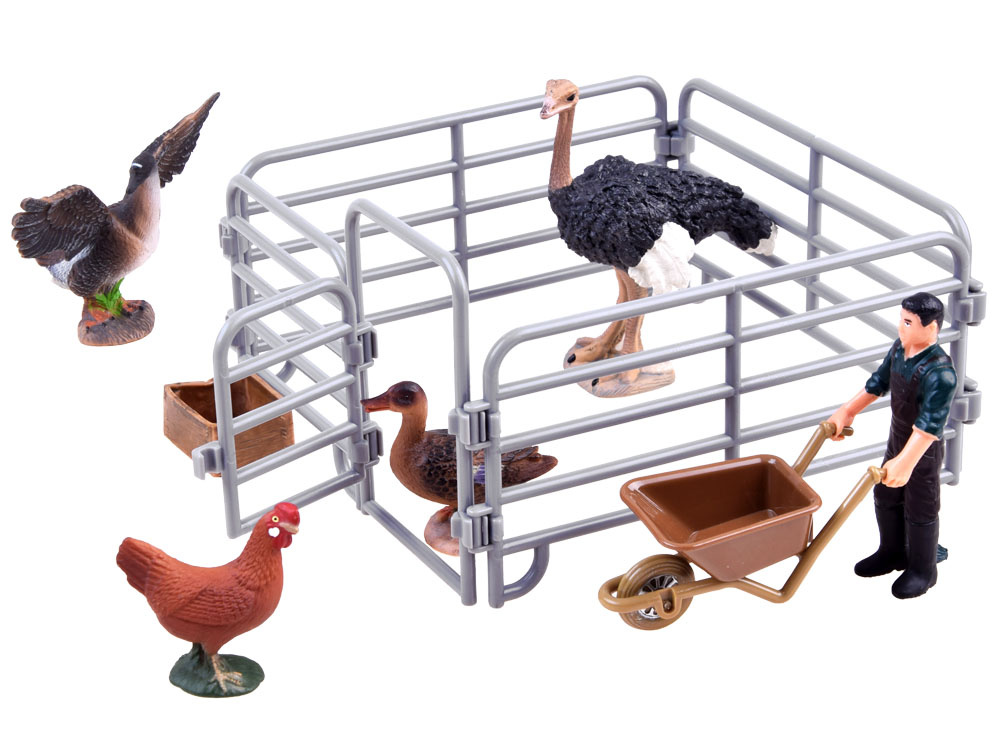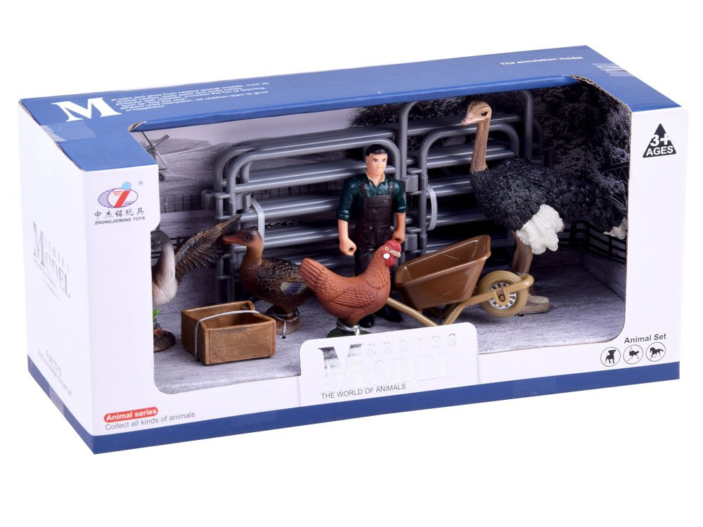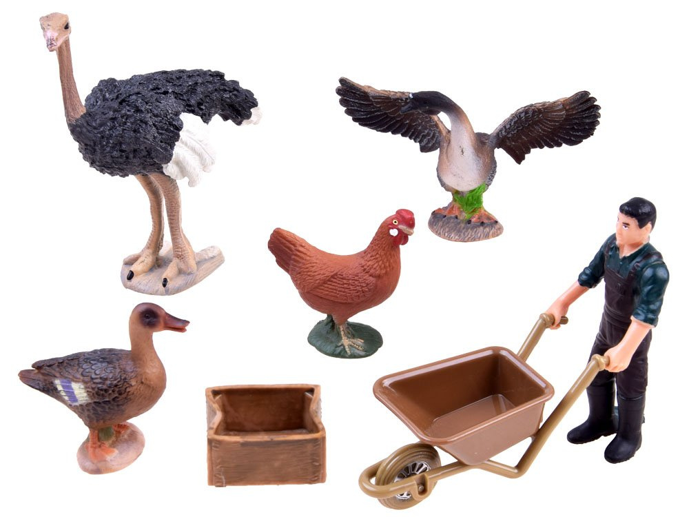 Комплектът включва щраус и кокошка, гъска и патица. Точно както в истинската ферма, за всичко се грижи персонаж на фермер.