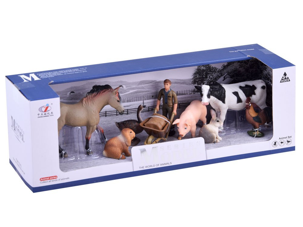 Комплектът съдържа m.in. прасе, крава, кон, заек и други. Точно както в истинската ферма, за всичко се грижи персонаж на фермер.
