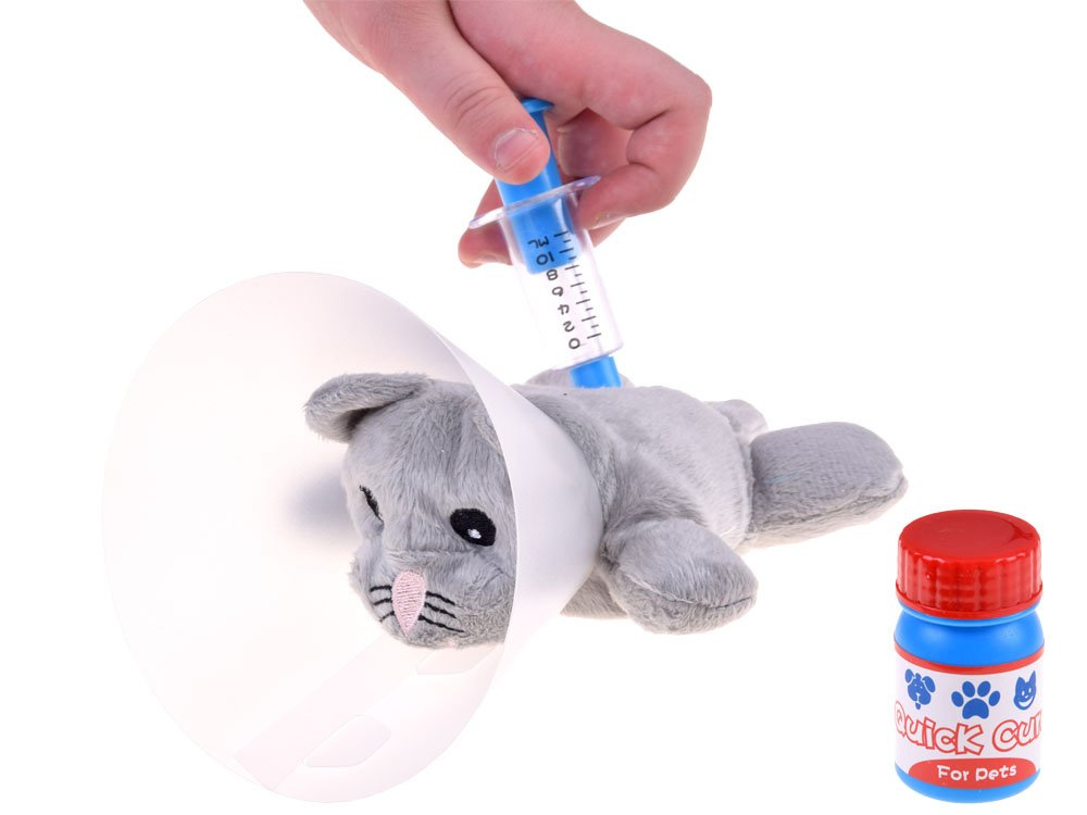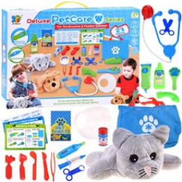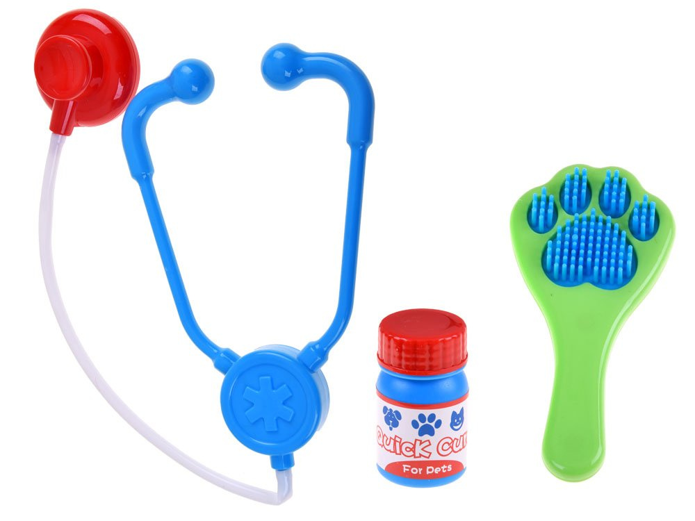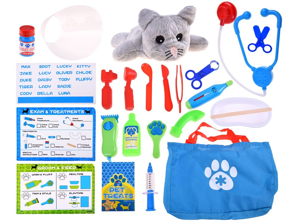 Този образователен комплект за млад ветеринарен лекар ще бъде полезен при оказване на помощ на плюшени талисмани, котенца, кучета и плюшени мечета.