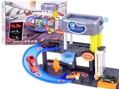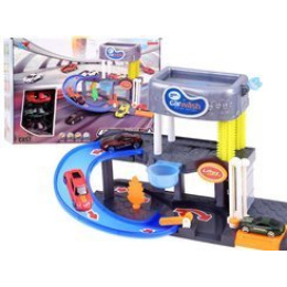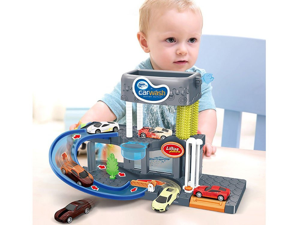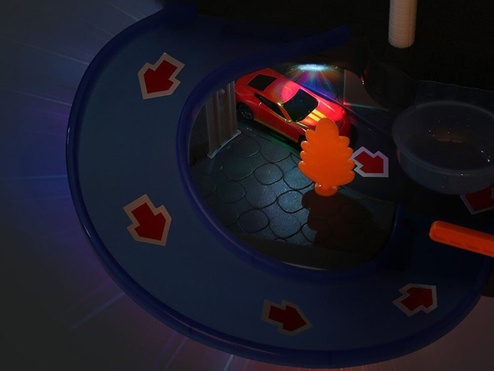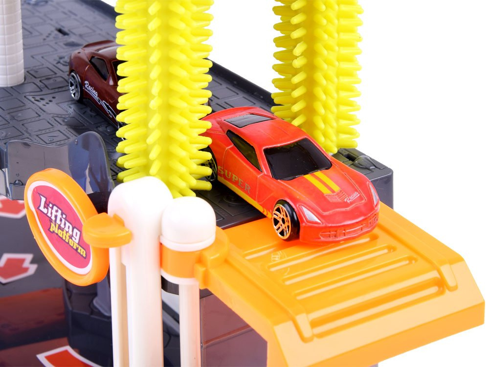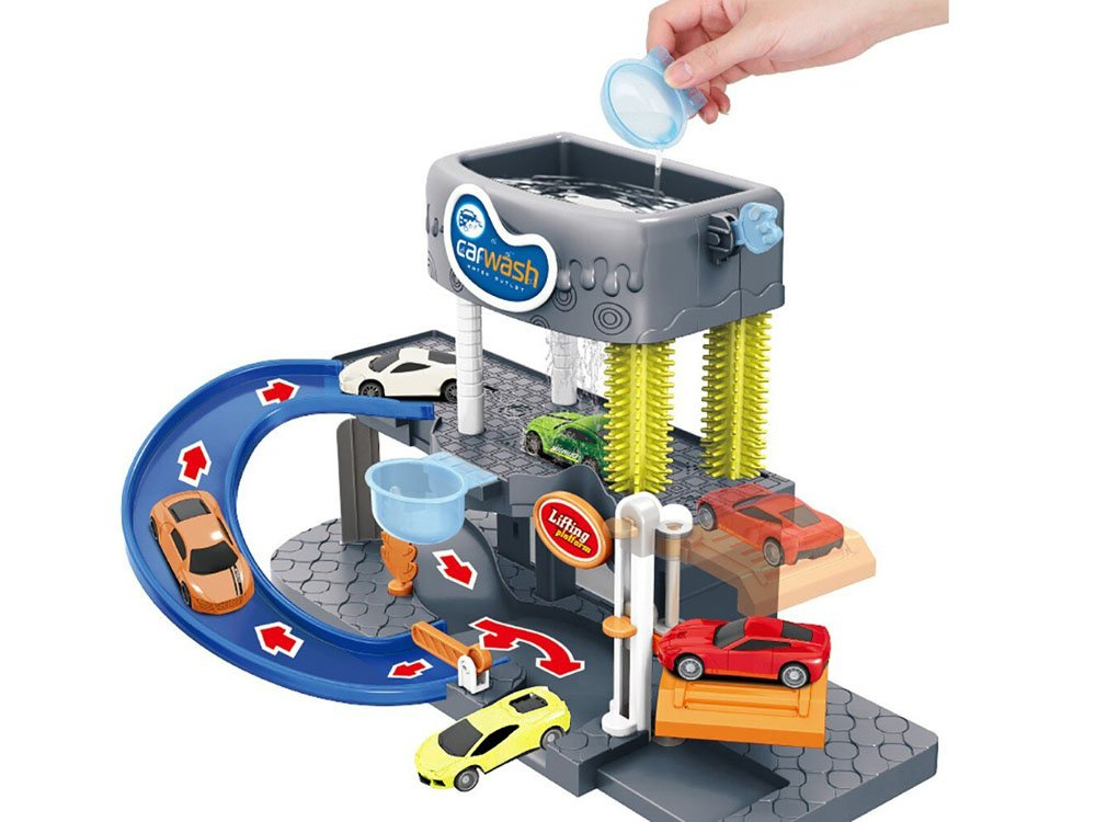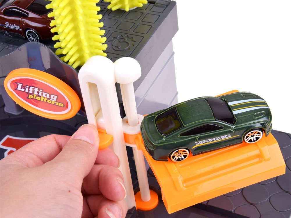 Целият комплект е изработен от пластмаса, на приземния етаж има асансьор, който може да се използва за качване на колата и след измиване на колата безопасно да се свали.За да измиете колата, поставете малко вода в горната част на играчката и след това използвайте синята лапа, за да разлеете водата, която пада върху колата. След измиването на праха от автомобила, той се спуска по стълбите, където се подсушава с кърпа. Той е снабден със стикери, светлинни и звукови ефекти, които допринасят за забавлението.