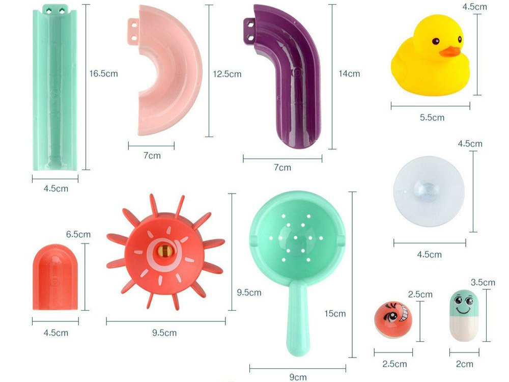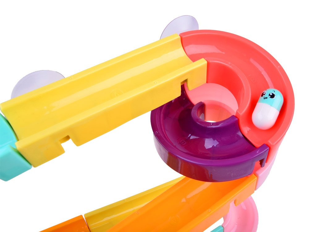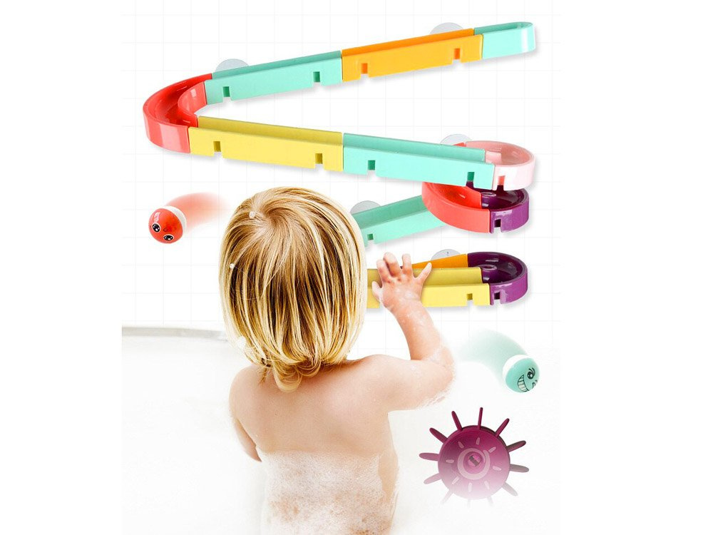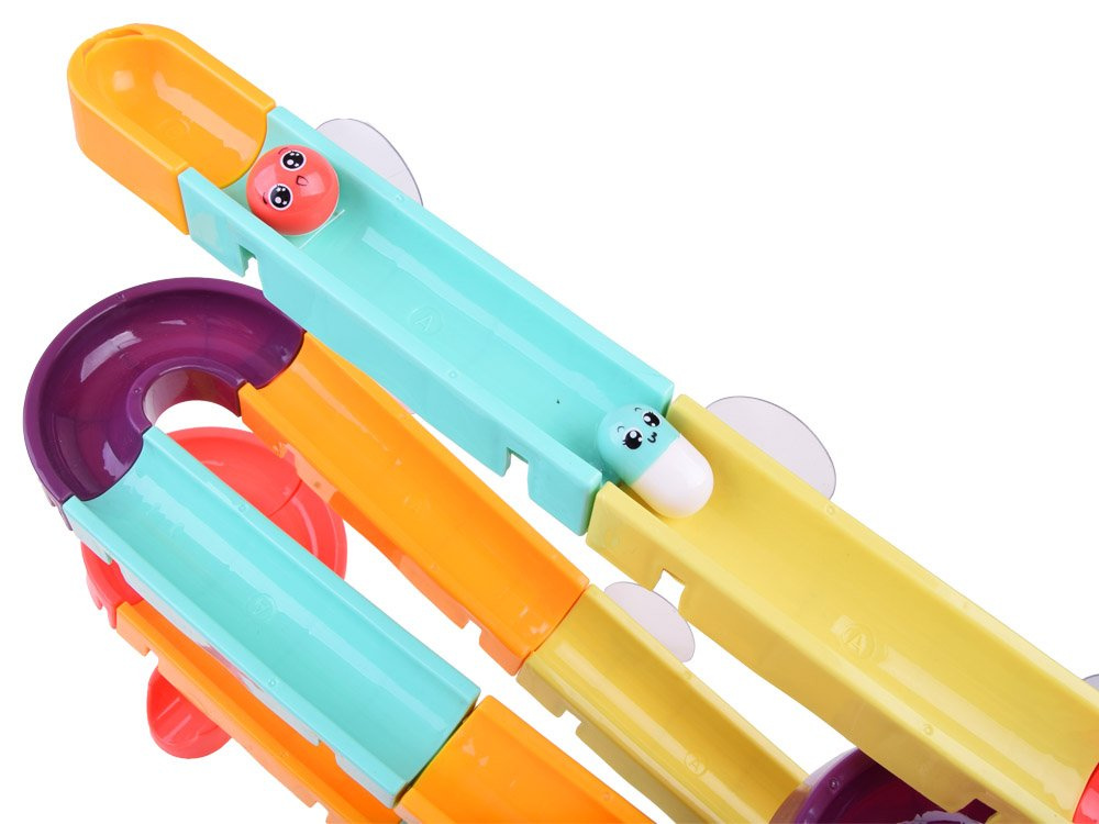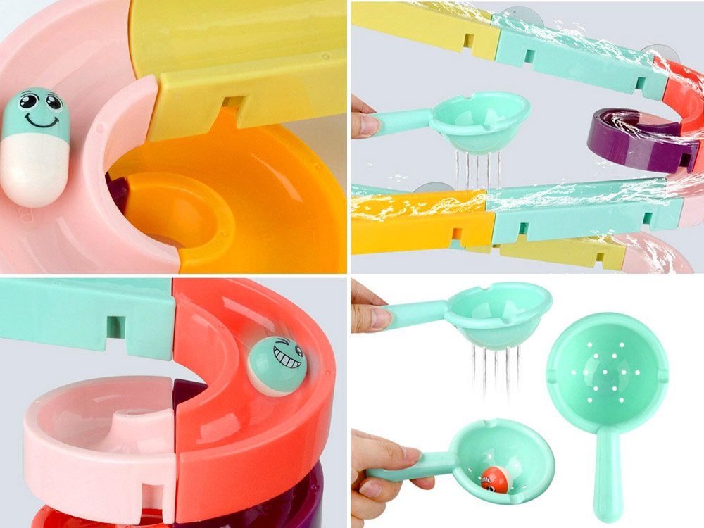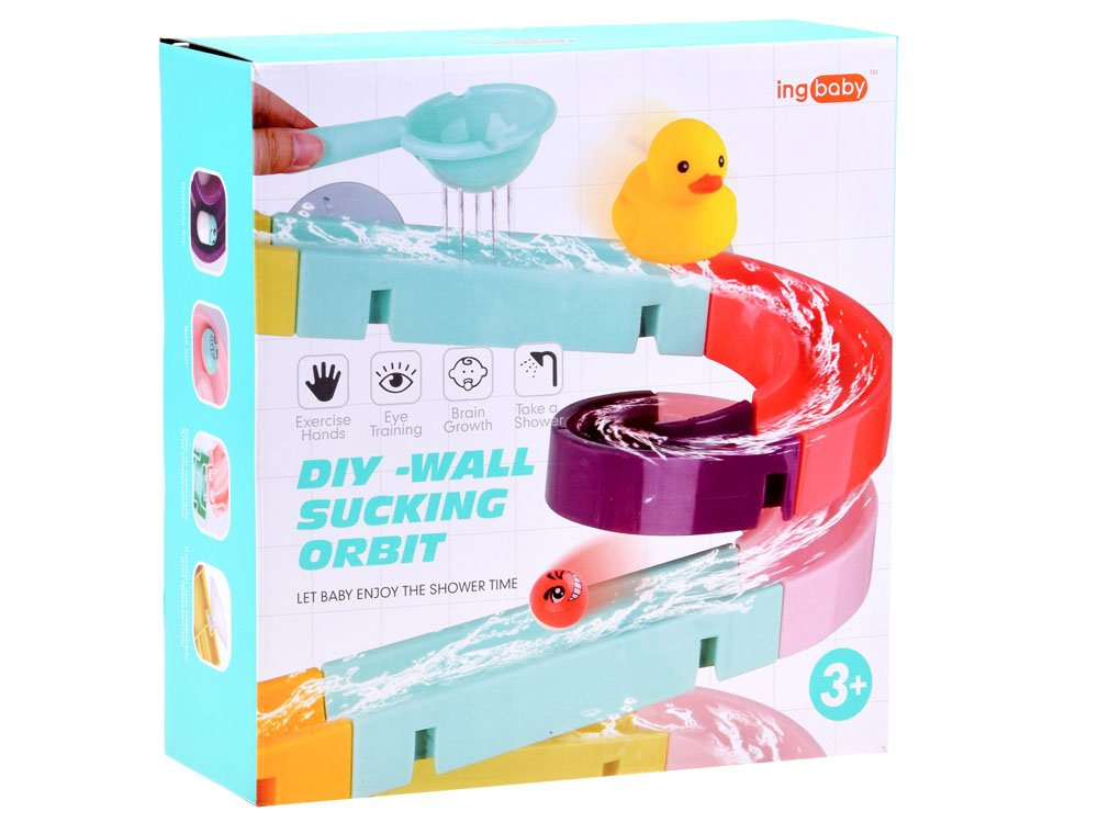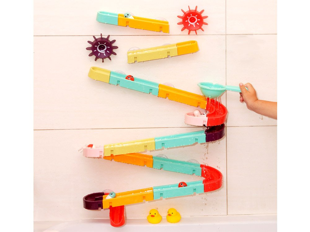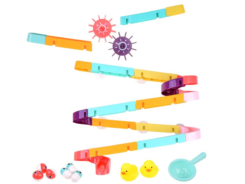 Комплектът е изработен от пластмаса и е снабден със силиконови вендузи, за да може да се закрепи към плочките в банята. В пакета са включени цветни елементи за построяване на спираловидна писта, гумени патици, топки, бобчета и цедка. Когато се къпе, детето може да си измисли фантастични игри с бягаща патица, гонеща се топка и ролки, които могат да се залепят една до друга, така че детето да върти и двете едновременно. Комплектът се състои от 44 части, от които можете да построите пързалка.