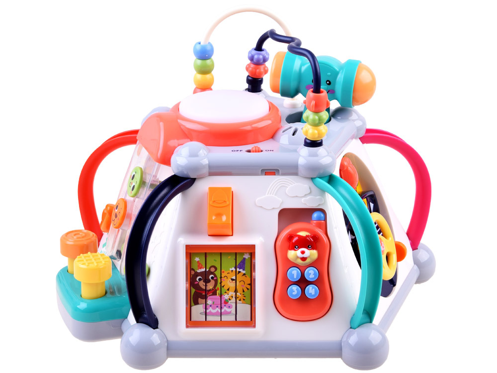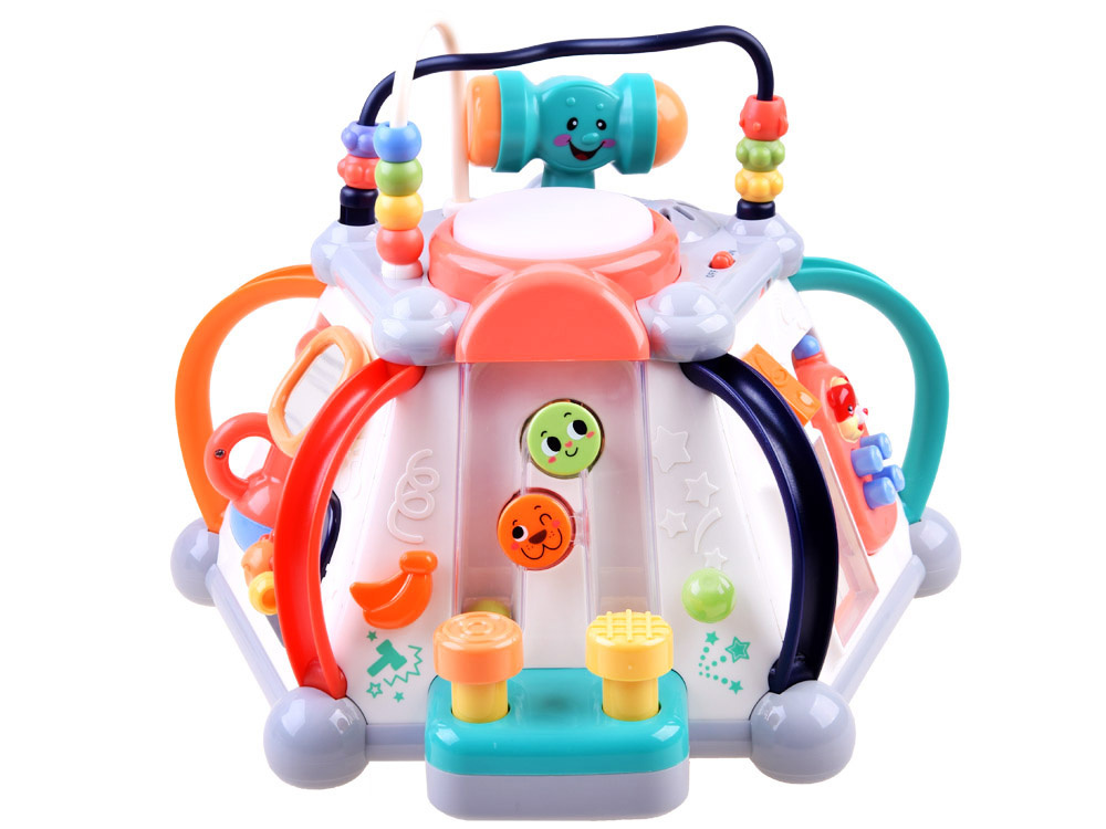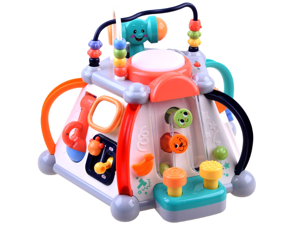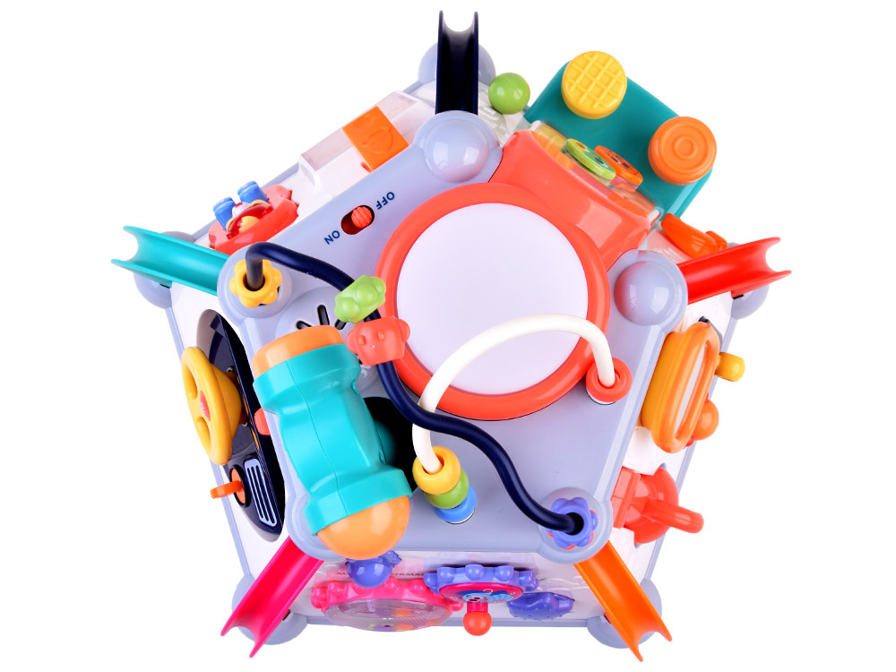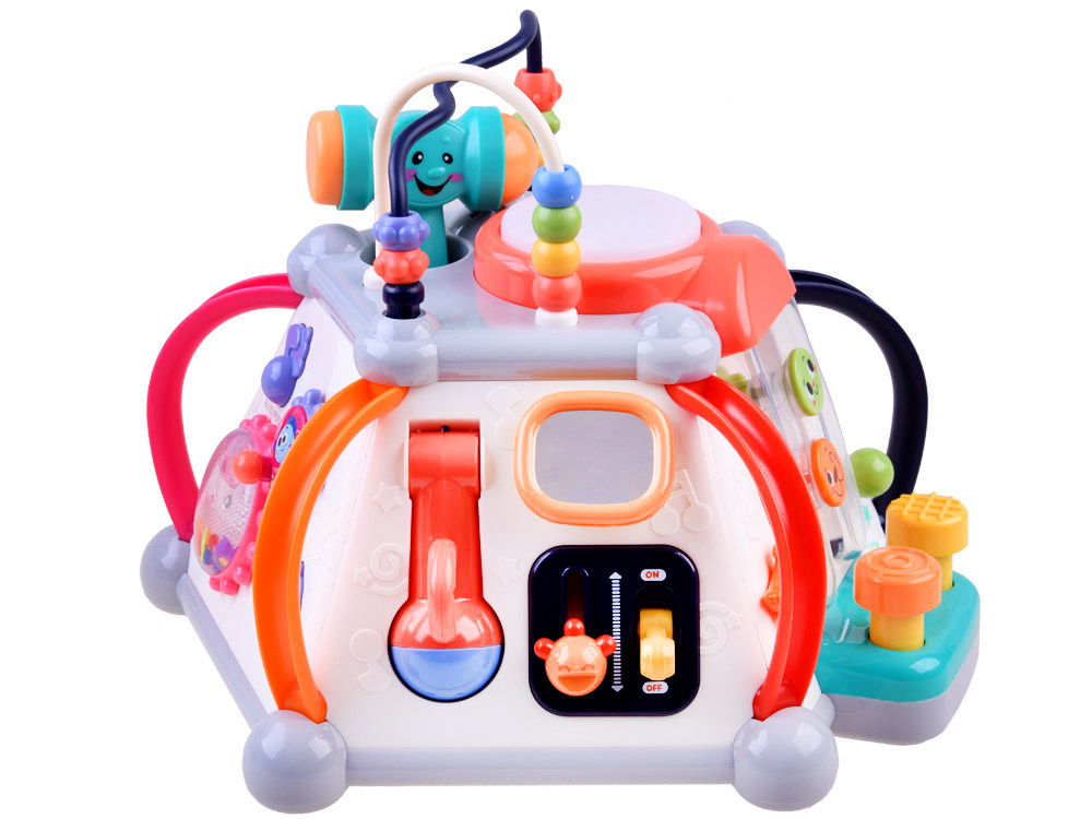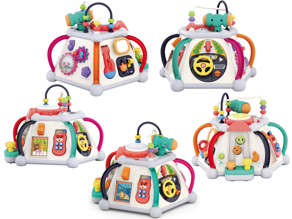 Играчката има пет интерактивни повърхности и една горна повърхност, както и лабиринт от цветни мъниста за упражняване на ръчните умения. Всяка стена с играчки има различен комплект за игра и обучение. Той е изработен много солидно и впечатляващо в много приятни съчетаващи се цветове.