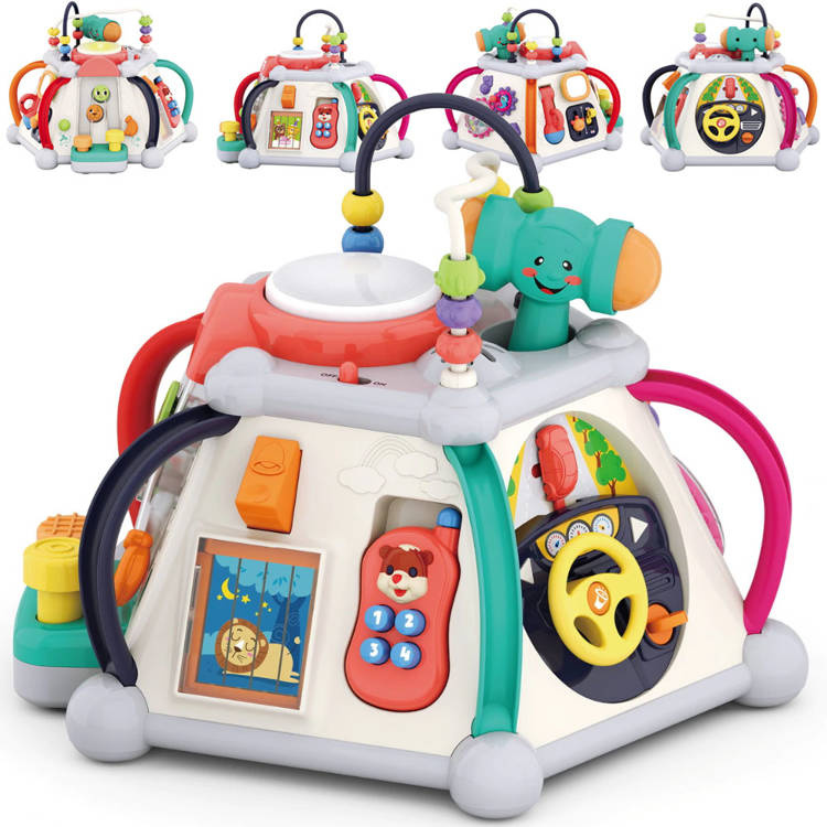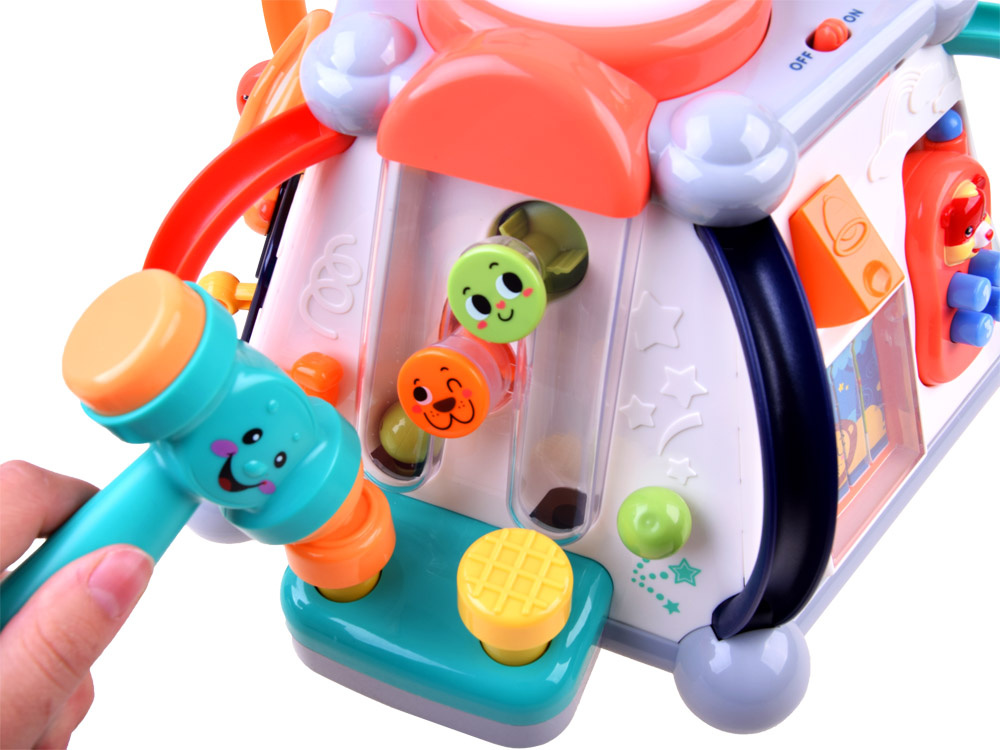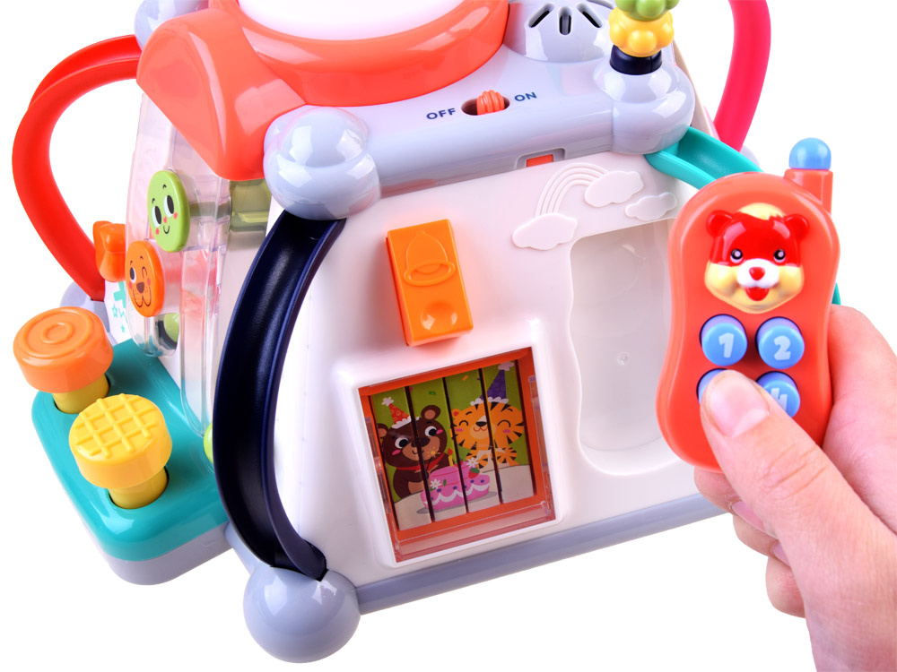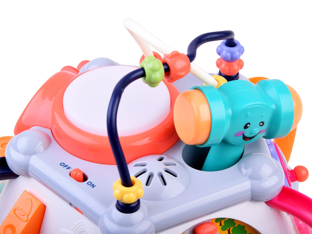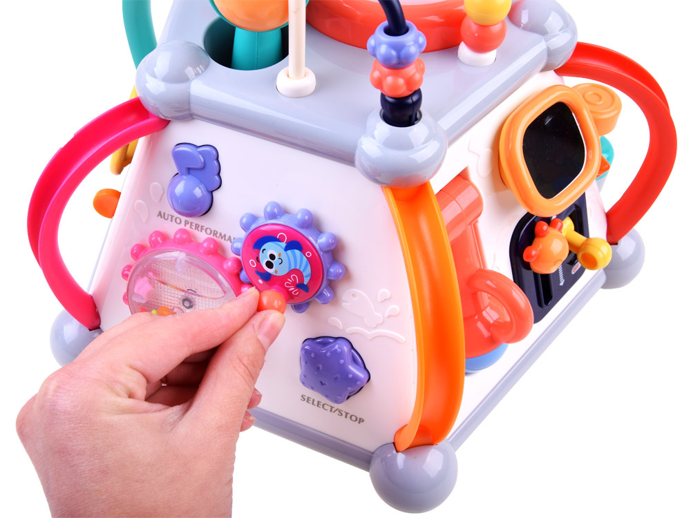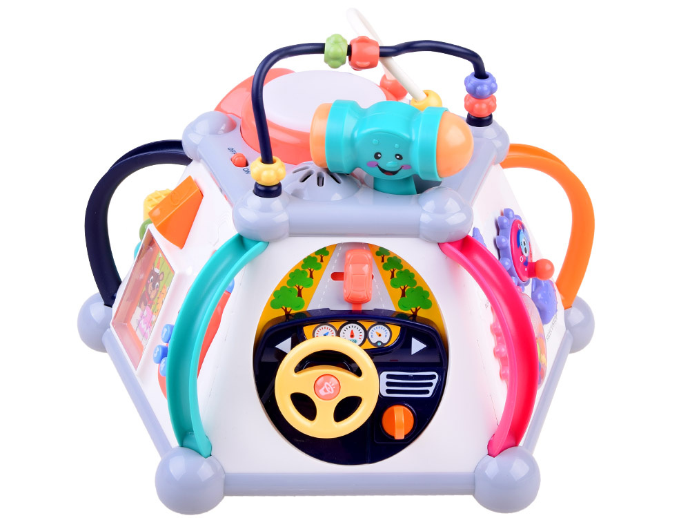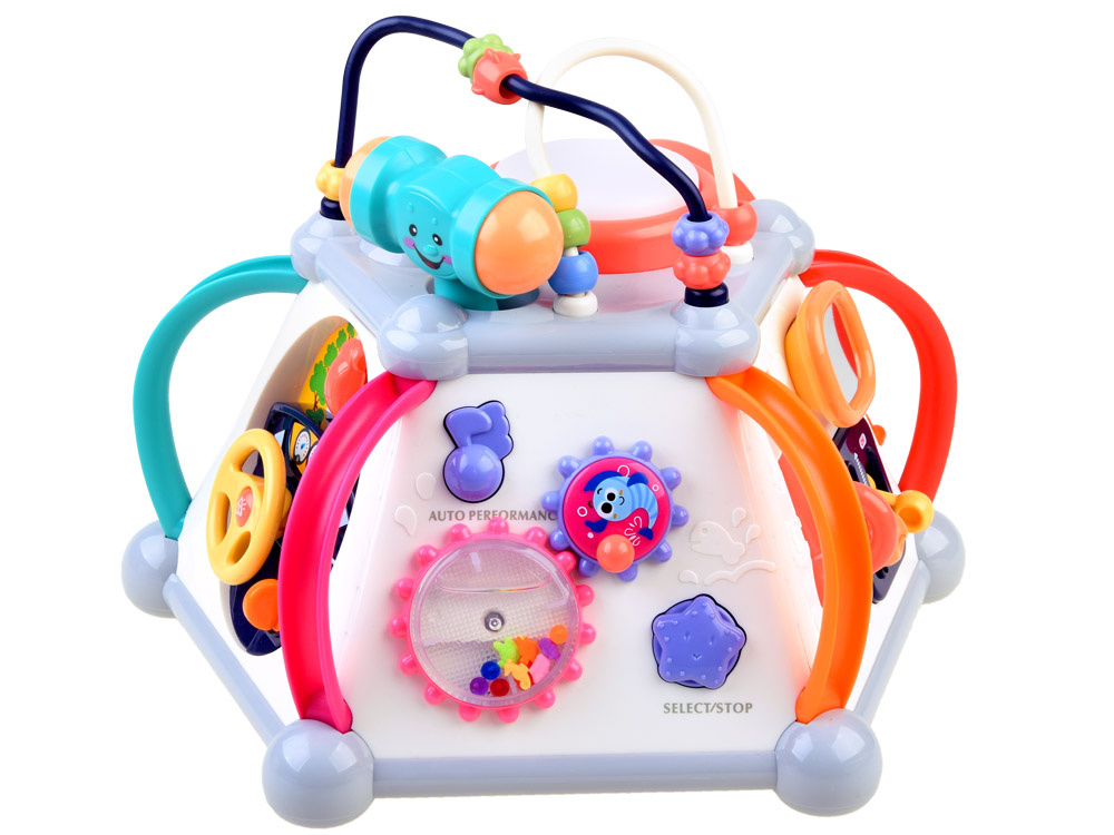Играчката има пет интерактивни повърхности и една горна повърхност, както и лабиринт от цветни мъниста за упражняване на ръчните умения. Всяка стена с играчки има различен комплект за игра и обучение. Той е изработен много солидно и впечатляващо в много приятни съчетаващи се цветове.