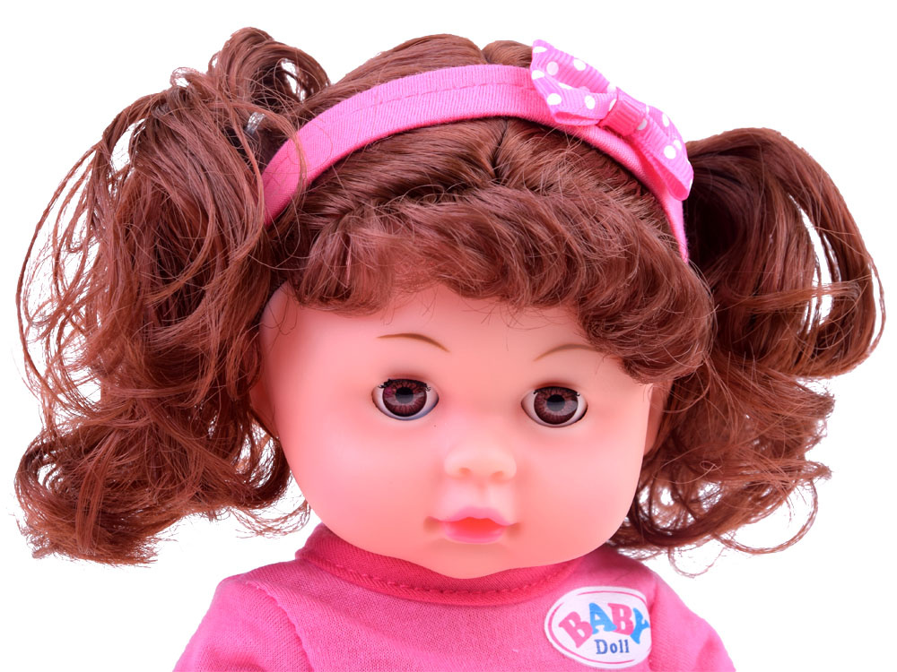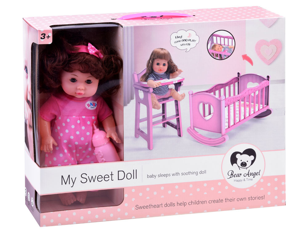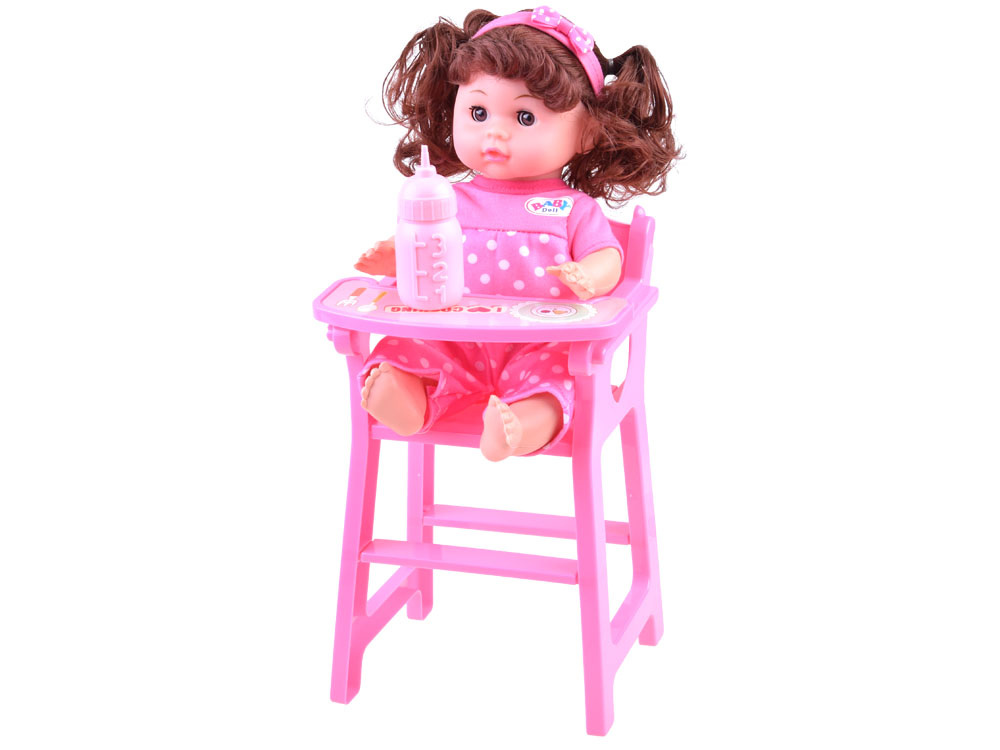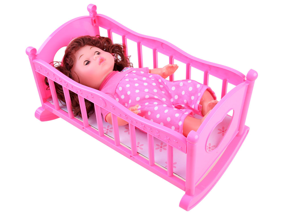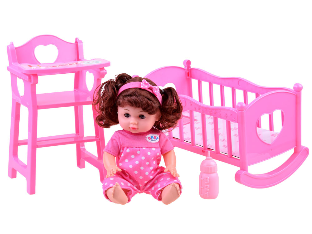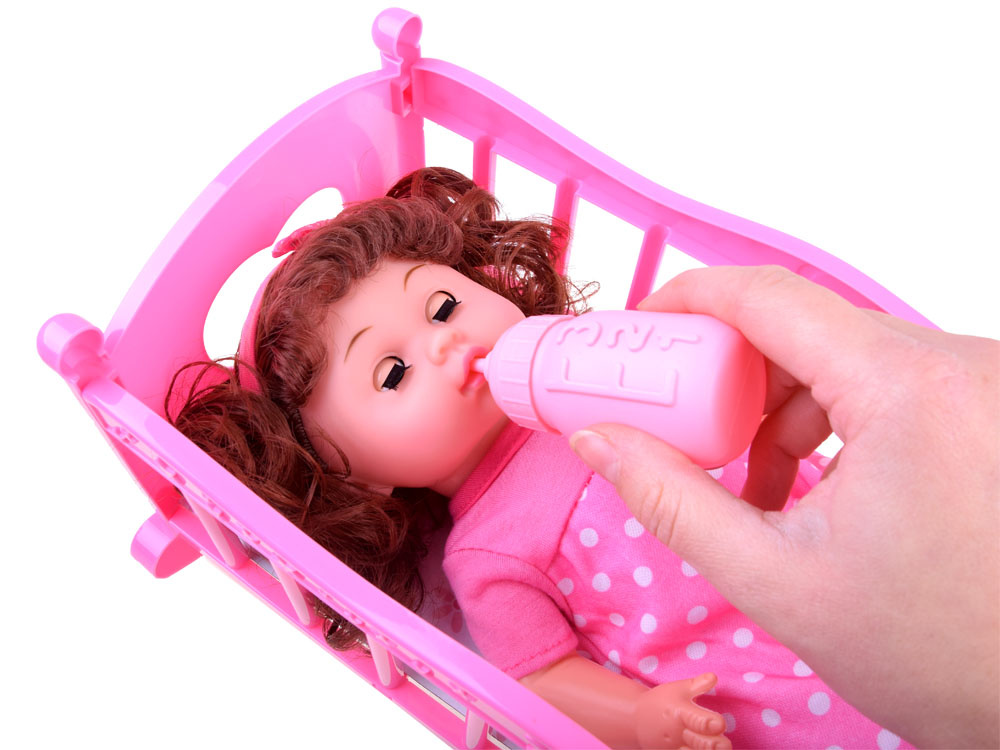 Красива кукла с комплект аксесоари ще зарадва всяко момиченце. Комплектът съдържа розови аксесоари за кукла: легло, столче и бутилка за хранене. Бебето има функция за пиене (благодарение на връвта), просто напълнете бутилката с вода, дайте на бебето да пие, сложете пелена или бързо отидете на гърнето. Куклата има речева функция благодарение на високоговорителя, вграден в коремчето й.Казва на полски думите: мама, татко и също така се смее, плаче, издава звуци на ядене и пиене и т.н. Тя е облечена в красив розов гащеризон на точки и на главата си има сладка розова лента с панделка. Всички части на шкафа могат лесно да се свалят, когато искаме да променим облеклото му. Куклата има дълга къдрава коса, събрана в две опашки, които й придават чар. Тялото на куклата е изработено от пластмаса и има подвижни ръце и крака, докато главата на куклата е гумена. Когато сложите куклата по гръб, очите й се затварят. Бутилката, столчето и леглото са изработени изцяло от пластмаса, леглото се доставя с картонен матрак.