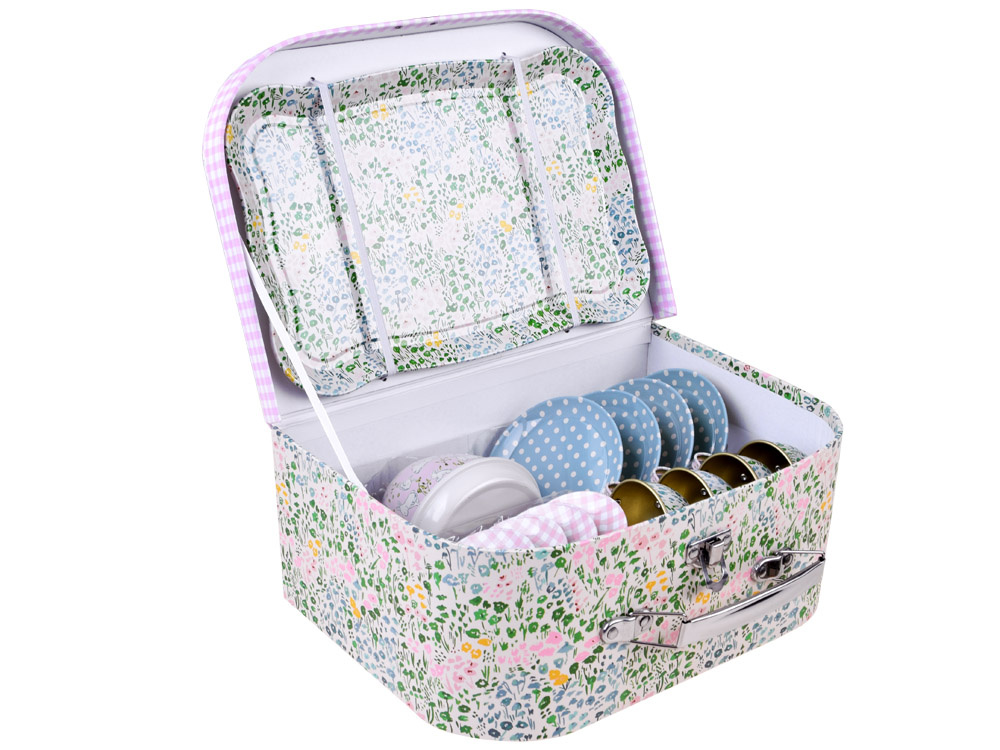 Куфарът е изработен от твърд картон в очарователен дизайн на ливада и каре с допълнителни метални елементи и ще бъде подходящ за пикници, детски площадки или паркове.